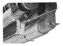 Directly behind the mold disk is the crucible, which contains molten type metal at an optimal 535°. At the moment before casting, the mold disk moves forward on its slide. Studs in the mold disc engage with blocks on the vise so that the mold disc seats gently, yet tightly and squarely against the line of matrices held in the first elevator jaws and between the vise jaws. The vise jaws compress the line of matrices so molten metal is prevented from squeezing between the mats on cast. The crucible tilts forward, forcing the mouthpiece tightly against the back of the mold. The plunger in the well of the crucible quickly descends, forcing the molten metal up the crucible throat and injecting it into the mold cavity through the array of orifices in the mouthpiece. The jets of molten metal first contact against the casting face of the matrices, and then fills the mold cavity to provide a solid slug body.[18] These have character shapes punched into them, so the result is a cast slug with the character shapes of the line on its top face. The mold disk is sometimes water-cooled, and often air-cooled with a blower, to carry away the heat of the molten type metal and allow the cast slugs to solidify quickly.[19]