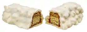 The Lion bar consists of a filled wafer, caramel (32%) and crisp cereal (26%), covered in milk chocolate (42%).[1] It was introduced by Eric Nicoli of Rowntree's in the 1970s, after a trial in the Dorset area in 1977. It was in some areas known as Big Cat until the late 1990s. When Nestlé acquired the brand in 1988, the recipe was changed as it used to contain peanuts, as was the packaging.