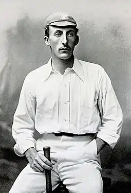 Over the following seasons, Palairet moved to "the front rank of amateur batsmen," according to W. G. Grace.[36] He played for Arthur Shrewsbury's England XI against Australia in 1893, and scored 71 runs as the English side won by an innings and 153 runs.[37][lower-alpha 2] He scored five half-centuries for Somerset that summer, and his batting average of 28.94 in the County Championship was bettered only by Hewett among his teammates.[38] The next year, Palairet made a big score against his former university. Facing a team that included his brother, Richard Palairet, and was captained by Fry, he made 181 runs in Somerset's second innings, the highest first-class score of his career to that point.[39] He also scored a century against Nottinghamshire, making 119 runs before being out leg before wicket to his old trainer Attewell.[40] He fell just short of 1,000 first-class runs in 1894; though two half-centuries scored against the touring South Africans in matches not considered first-class would have taken him over the milestone.[41][42]