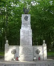 During the invasion of Poland, which started World War II, the town was raided by the Germans on 2 September 1939 and captured on 8 September.[1] During the German occupation, Poles were subject to mass arrests, expulsions and executions. A prison for Poles was established in the town.[9] In October 1939, the Germans carried out mass arrests of Polish teachers and landowners from Lipno and surrounding villages, deceitfully gathering them to Lipno for alleged conferences on town matters.[10] 71 teachers and several dozen landowners were arrested, imprisoned in concentration and forced labour camps, and mostly later murdered.[11] Also 20 priests were arrested and imprisoned in the Stutthof concentration camp, where 13 of whom died.[1] Around 200 Poles and Jews from Lipno and surrounding villages were murdered in the forest near Karnkowo.[12][1] Next mass arrests of Poles were carried out in April 1940.[1] 10 Poles were murdered in a public execution at the market square on 3 November 1940.[1] The pre-war mayor Zygmunt Uzarowicz was arrested and imprisoned in Grudziądz in 1940, and then deported to the Dachau and Buchenwald concentration camps, where he was beaten to death by the Germans in 1942.[8] In addition, about 3,300 Poles were expelled from the Lipno County, and Jews were deported to Nazi ghettos, however Poles managed to create an underground resistance movement.[1] In 1939, the Germans destroyed the Polish monument from 1930.[13] It was rebuilt in 1992.[13]