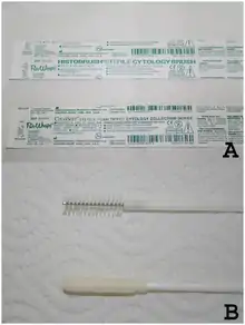 Liquid-based cytology is a method of preparing samples for examination in cytopathology. The sample is collected, normally by a small brush, in the same way as for a conventional smear test, but rather than the smear being transferred directly to a microscope slide, the sample is deposited into a small bottle of preservative liquid. At the laboratory, the liquid is treated to remove other elements such as mucus before a layer of cells is placed on a slide.[1] The technique improves specimen adequacy and HSIL detection.[2] The United Kingdom screening programmes changed their cervical screening method from the Pap test to liquid-based cytology in 2008.[3]