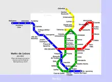 On 8 May 2017, the government of Portugal announced an extension of the Yellow Line to Cais do Sodré as part of a new operational master plan. The extension, which would connect the Yellow Line with the Green Line and was expected to open in 2024, would contain two new stations at Estrela and Santos; Campo Grande would also be reconstructed as part of the project. Construction on this extension was initially expected to begin in early 2019.[10] Once the extension is placed into service, the Green and Yellow lines would be reorganised: the Green Line would run as a circular route and would take over the section of the Yellow Line between Campo Grande and Rato, while the Yellow Line would run between Odivelas and Telheiras.[11] This extension has been opposed by several groups, including the government of Odivelas and the PSD; the latter proposed a bill to the government in July 2019 that would call for the suspension of the project in favour of a metro extension into Loures.[12][13] The government of Portugal announced the suspension of the project on 5 February 2020 due to budgetary concerns.[14]