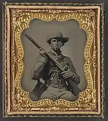 Confederate cavalryman John [B] Dupont[e?] of Dartmouth, Alabama with muzzle-loading shotgun and a "Square D" handle Bowie knife'; he served in Lewis Battalion, Alabama Cavalry[1]