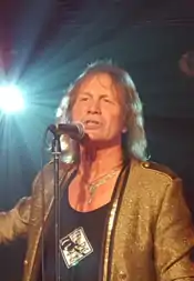 In mid-1980, Crane reformed Atomic Rooster with former guitarist and vocalist Du Cann.[12] Preston Heyman performed drums on the band's self-titled comeback album.[13] Former Cream drummer Ginger Baker joined for a brief period in September,[14] but had left within a month to join Hawkwind.[15] Paul Hammond had returned to the band by the end of the year, marking a reunion of the Death Walks Behind You lineup.[3] Du Cann left in 1982, with guitars on the band's seventh album Headline News performed by new member Bernie Tormé and Pink Floyd's David Gilmour.[16] After a few months of touring, with more lineup changes, Atomic Rooster disbanded again in late 1983.[3] Crane committed suicide in 1989,[17] while Hammond died of an accidental drug overdose in 1992,[18] and Du Cann died after a heart attack in 2011.[19]