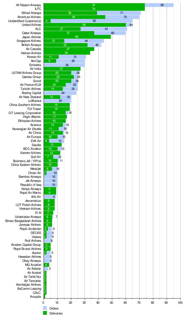 This article lists the orders and deliveries for the Boeing 787 Dreamliner. As of May 2020, the largest airline orders are by All Nippon Airways (95), Etihad Airways (71), American Airlines (70) and United Airlines (64).[lower-alpha 1]
