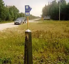 | Four Falls | Brown Road | East Road | Russell Road | Canada still provides Customs services seasonally, but US-bound traffic is prohibited, and has been since the US border station closed in the 1960s. However until 2008, US-bound traffic was permitted to use the road to the Aroostook Valley Country Club, which is in both countries. Several Canadian properties can only be accessed via the US part of the road, which pre-dates the establishment of the border; several residents have experienced harassment from U.S. Border Patrol officers since 9/11.[31][32] | ![]() |