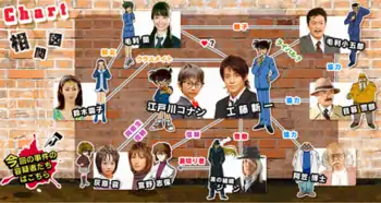 Jimmy Kudo, known as Shinichi Kudo (工藤 新一, Kudō Shin'ichi) in Japan, is the main protagonist of the series, a high school detective who solves difficult cases for the police. During one of his investigations, he is attacked and forced to take an experimental poison by a member of the Black Organization. However, due to a rare side-effect, he shrinks to the form of a young child.[ch. 1] In order to keep his true identity a secret, he now goes under the alias Conan Edogawa (江戸川 コナン, Edogawa Konan) and pretends to be a real child to throw off suspicion while he secretly solves many cases and looks for clues about the organization.[ch. 2] He loves his childhood friend Rachel Moore, but cannot confess his feelings or reveal his true identity in order to protect her. However, Rachel later discovers he really is Shin'ichi, but does not tell anyone else in case her prediction is wrong. [vol. 1] His two Japanese voice actors are Kappei Yamaguchi for Jimmy and Minami Takayama for Conan.[3][4] He is voiced by Jerry Jewell for Jimmy and Alison Viktorin for Conan in Funimation's English dub,[5] and Griffin Burns for Jimmy and Wendee Lee for Conan in Bang Zoom! Entertainment's English dub.[6] In the first and second live drama he was portrayed by Shun Oguri in teenage form and Nao Fujisaki in child form.[7][8] In the dramas following the two, he is portrayed by Junpei Mizobata.[9]