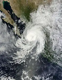 The majority of tropical cyclones form and organize in areas of warm sea surface temperatures, usually of at least 26.5 °C (79.7 °F) and low vertical wind shear; however, there are outliers to this general rule, such as storms that manage to intensify despite high amounts of vertical wind shear. When a pre-existing tropical disturbance – usually a tropical wave or a disturbance originating in the Intertropical Convergence Zone – enters an area where the aforementioned conditions are present, the disturbance can develop into a tropical cyclone, provided it is far enough from the equator to experience a sufficiently strong Coriolis force, which causes the counterclockwise rotation of hurricanes in the Northern Hemisphere.[9] Between the months of December and April, sea surface temperatures in the tropics, where most Northeast Pacific tropical cyclones develop, are usually too low to support significant development. Also, the presence of a semi-permanent high-pressure area known as the North Pacific High in the eastern Pacific greatly reduces tropical cyclone development in the winter months, as the North Pacific High results in vertical wind shear that causes environmental conditions to be unconducive to tropical cyclone formation. Another factor preventing tropical cyclones from forming during the winter is the presence of a semi-permanent low-pressure area called the Aleutian Low between January and April. Its effects in the central Pacific near the 160th meridian west cause tropical waves that form in the area to move northward into the Gulf of Alaska. As the disturbances travel northward, they dissipate or transition into an extratropical cyclone. The Aleutian Low's retreat in late April allows the warmth of the Pacific High to meander in, bringing its powerful clockwise wind circulation with it. During the month of May, the Intertropical Convergence Zone migrates southward while vertical shear over the tropics decrease. As a result, the earliest tropical waves begin to form,[10] coinciding with the start of the eastern Pacific hurricane season on May 15.[8] During summer and early fall, sea surface temperatures rise further, reaching 29 °C (84 °F) in July and August, well above the 26.5 °C (79.7 °F) threshold for the formation and intensification of tropical cyclones. This allows for tropical cyclones developing during that time to strengthen significantly, perhaps even rapidly.[10]