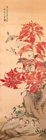 | Three Friends of Winter with a Pair of Cranes, colour on silk, by Tanomura Chikuden 絹本著色歳寒三友雙鶴図〈田能村竹田筆/〉 kenpon chakushoku saikan sanyū sōkaku zu (Tanomura Chikuden hitsu) | 1832 | ![]() | 150 centimetres (59 in) by 57 centimetres (22 in) | |||||