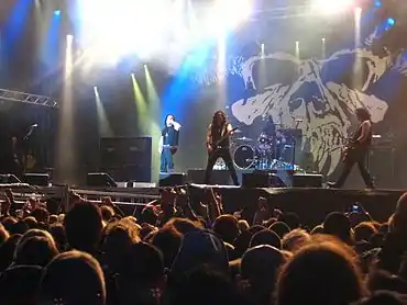 Resnik left Danzig for a second time in April 2000, with former D Generation bassist Howie Pyro (real name Howard Kusten) taking his place.[11] The lineup of Danzig, Youth, Pyro and Castillo released Live on the Black Hand Side in 2001 and Danzig 777: I Luciferi in 2002, before Castillo left to join Queens of the Stone Age.[12][13] He was replaced for two shows in October 2002 by Halfcocked's Charlee Johnson, and later by Type O Negative's Johnny Kelly, before Bevan Davies took over the following summer.[14] The rest of the lineup also changed in 2003 – first it was announced that Youth had left the band, with Tommy Victor returning in his place;[15][16] and a few weeks later it was added that Pyro had been replaced by former Nothingface bassist Jerry Montano.[17] This lineup of the band released Circle of Snakes in 2004.[18]