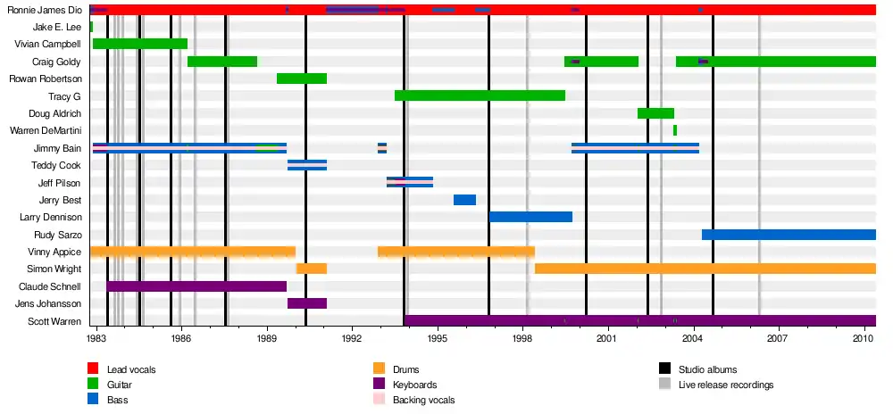 Appice was replaced, again, by Simon Wright.[20] The following year, former members Goldy and Bain also returned.[21][22] Again, Goldy only lasted one album – 2000's Magica – before he was replaced by Doug Aldrich in January 2002.[23] The new guitarist recorded Killing the Dragon, but by early 2003 had left due to "scheduling conflicts" with his other group Whitesnake.[24] Aldrich was originally set to be replaced by Ratt guitarist Warren DeMartini,[25] however he was replaced within a month by the returning Goldy.[26] Bain also left in early 2004.[27] Pilson returned to perform on Master of the Moon, with former Ozzy Osbourne bassist Rudy Sarzo taking over on tour from July.[28] Aldrich would later return to fill in for Goldy on tour in 2005 due to an arm injury,[29] and again in 2009 due to scheduling conflicts with Budgie.[30]