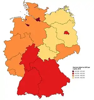 This article is about the gross regional product (GRP) per capita of German states in nominal values. Values are shown in EUR€. For easy comparison, all the GRP figures are converted into US$ according to annual average exchange rates.[1][n 1] All values are rounded to the nearest hundred.