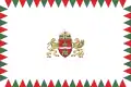 A white flag bordered with a red and green „flame” pattern, charged with the combined coat of arms of the Lands of the Holy Hungarian Crown flanked by two angels in the center. | ||