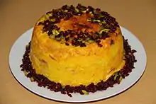 | Dami | Rice that is cooked almost the same as kateh, but at the start, ingredients that can be cooked thoroughly with the rice (such as grains and beans) are added. While making kateh, the heat is reduced to a minimum until the rice and other ingredients are almost cooked. If kept long enough on the stove without burning and over-cooking, dami and kateh can also produce tadig. A special form of dami is tachin, which is a mixture of yogurt, chicken (or lamb) and rice, plus saffron and egg yolks. |