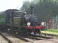 Ajax was built to order by the former Sulphide Corporation of London, where she stayed for many years before moving overseas to Iran for work at the Anglo-Persian Oil Company. Several years later she was repatriated and worked at Llandarcy Refinery, until retirement in 1968. The owner moved her the Havenstreet for restoration, though for over two decades she was stored in the shed until work began. The boiler passed its steam test in 2003 and within two years Ajax returned to work with air brakes fitted for passenger trains. Ajax was withdrawn from service at the beginning of 2015, following the completion of her boiler ticket. Currently, no plans for her future have been drawn up, and she is stored in the Train Story building.[13] | Lined Black. | Isle of Wight Steam Railway. | 1918 | ![]() |