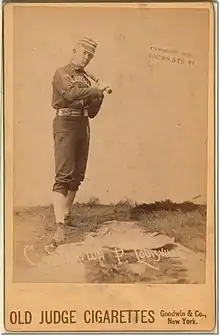 The Louisville Colonels were a Major League Baseball team that played from 1882 to 1899 and were based in Louisville, Kentucky. The team played in the American Association from 1882 to 1891 and in the National League from 1892 to 1899.[1] The team was known as the Louisville Eclipse from 1882 to 1884.[1] The Colonels used 11 Opening Day starting pitchers in their 18 years as a Major League franchise. The first game of the new baseball season for a team is played on Opening Day, and being named the Opening Day starter is an honor, which is often given to the player who is expected to lead the pitching staff that season,[2] though there are various strategic reasons why a team's best pitcher might not start on Opening Day.[3] The Colonels had a record of 10 wins and 8 losses in their Opening Day games.