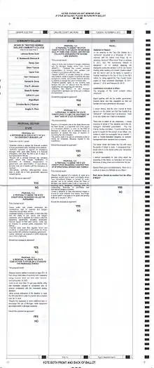 | Proposal 3 | 2,772,301 | 66.92% | 1,370,662 | 33.08% | Voting Policies in State Constitution Initiative. "Proposed constitutional amendment to regulate authorize no-reason absentee voting, require a straight party voting option on general election ballots, provide for automatic and Election Day voter registration, require post-election audits, and other voting changes."[33] |