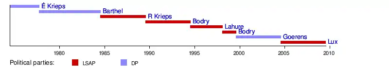 | Robert Krieps | LSAP | 20 July 1984 | 14 July 1989 | Jacques Santer | |