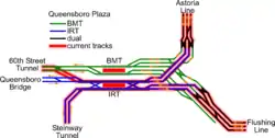 As part of the Dual Contracts, the Astoria Line and Flushing Line were operated by both the Interborough Rapid Transit Company and the Brooklyn–Manhattan Transit Corporation. This arrangement remained through unification, until, starting October 17, 1949, the Astoria Line became BMT-only and the Flushing Line IRT-only. A cross-platform transfer at Queensboro Plaza, where the lines meet, was made available by closing the north (BMT) half of the station and routing all trains into the south (IRT) half.[68] |