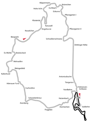 - "auf dem 24,433 Kilometer langen Kurs aus Nürburgring-Nordschleife und der Sprintstrecke des GP-Kurses samt integrierter Mercedes-Arena"
