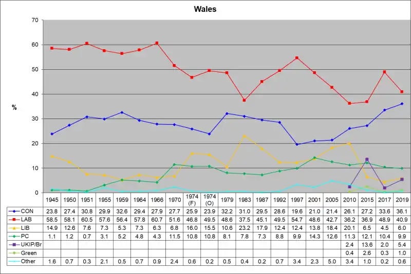 Wales is divided into forty Parliamentary constituencies which elect Members of Parliament to the House of Commons of the United Kingdom. After the General Election of December 2019, 22 of the Welsh constituencies are represented by Labour MPs, 14 by Conservative MPs, and 4 by Plaid Cymru MPs. [1]