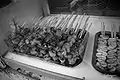 Barbecue and meat on display at a street food stall during the Dinagyang Festival in Iloilo City, Philippines.