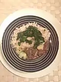 Meat dish | A beef roulade often prepared for special occasions it consists of thin sheets of cooked eggs and marinated beef layered one on top of the other, then wrapped and tied around carrots, celery, cheese, pork fat, and sausage. This is then cooked in seasoned tomato sauce. | |