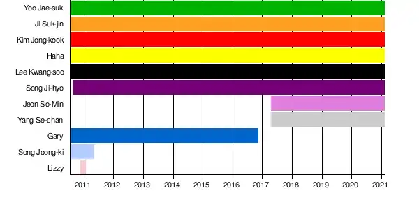 The original members of Running Man are Yoo Jae-suk, Ji Suk-jin, Kim Jong-kook, Gary, Haha, Lee Kwang-soo, and Song Joong-ki.[1] Song Ji-hyo was originally a guest for the second (episode 2-3) and third landmark (episode 4-5). She officially joined the program in the fourth landmark (episode 6) but was unable to attend until the fifth landmark (episode 7).[2] In April 2011, Song Joong-ki recorded his last episode (episode 41) in May, and has left the program to focus on his acting career but returned on episode 66 as a guest after leaving for almost half a year, and later made cameo appearances in several episodes.[3] Lizzy was initially a guest for episode 13 and episode 14, but later officially joined the program, starting episode 18. However, she has left the crew since episode 26 due to schedule conflicts with After School, the K-pop group she joined. She later makes a comeback as a guest in episode 292, after 5 years since her last appearance.[4][5] On October 25, 2016, Gary announced to be leaving the show to focus on his music career after being with Running Man for 6 years, but later returned as a guest, only a week after his final recording.[6] On April 3, 2017, it was confirmed through various media outlets that Running Man is adding comedian Yang Se-chan and actress Jeon So-min. The decision came after they showed their chemistry with the other members time when they guested on the show[7] But in first quarter of 2020, Lee Kwang-soo and Jeon So-min both temporarily dropped out of the program due to an accident and health problems respectively.[8]Lee Kwang-soo return on ep 497 while Jeon So-min return on ep 506.