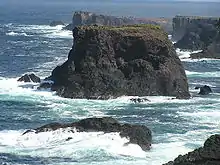 The geology of Shetland is complex with numerous faults and fold axes. These islands are the northern outpost of the Caledonian orogeny and there are outcrops of Lewisian, Dalradian and Moine metamorphic rocks with similar histories to their equivalents on the Scottish mainland. Similarly, there are also Old Red Sandstone deposits and granite intrusions. The most distinctive feature is the ultrabasic ophiolite, peridotite and gabbro on Unst and Fetlar, which is a remnant of the Iapetus Ocean floor.[5] Much of the island's economy depends on the oil-bearing sediments in the surrounding seas.[6] In the post-glacial epoch, c. 6200 BC, the islands experienced a tsunami up to 20 metres high caused by the Storegga Slides, an immense underwater landslip off the coast of Norway.[7][8]