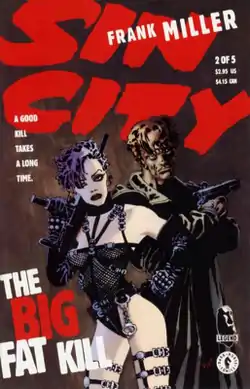 First published in five issues November 1994–March 1995, The Big Fat Kill opens in Shellie's apartment, where a drunken former fling is furiously rapping on her door, demanding to be let in. Shellie is obviously scared, but is comforted by Dwight who has gotten a new face (see A Dame To Kill For). Dwight tells the barmaid to let the man and his ensuing entourage in, expressing confidence in his ability to 'handle them'. When the man outside threatens to break down her door, Shellie reluctantly opens it while Dwight hides in the bathroom. Dwight deals with the man, who then leaves, heading into Old Town. The story deals with the repercussions of Dwight's and the Old Town Girls' actions towards him.