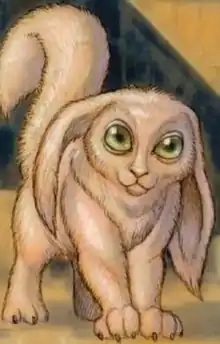Kushiban are small rabbit-like creatures that live on Kushibah in the Star Wars galaxy. Distinguishing features include large black eyes, floppy ears, and a long tail. They are capable of walking on either their hind legs or on all fours, though to move more quickly in a run or a charge, they must run with all four appendages. On their hind legs they stand at 0.5 meters or 1.6404 feet tall, with an extra 0.3 meters' worth of tail. While often mistaken for cute, pet-like animals, they are actually intelligent beings with a complex culture as well as both a written and spoken language. They have mastered fire (used to frighten away hostile, fire-fearing Xinkras) and can use technology. Rather than paws, they have hands with opposable thumbs and feet. As a means of communication, Kushibans' fur changes color in correlation to its mood. A Kushiban in a calm, normal state of emotions is white; a Kushiban in the deepest of despairs is totally black.