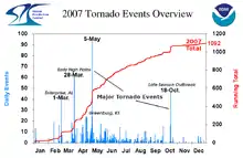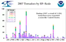 This page documents all the tornadoes that touched down in the United States during 2007. Tornadoes in the month of January are given with their Fujita Scale intensity while all tornadoes from February and on are given with their Enhanced Fujita Scale intensity. This is because the scale was changed on February 1 due to the National Weather Service implementing a more accurate way to classify tornadoes.
