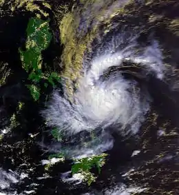 The Northwest Pacific basin covers a vast area in the Pacific Ocean, located north of the equator, between 100°E and 180°E.[1] Several weather agencies monitor this basin, however it is officially monitored by the Japan Meteorological Agency (JMA, RSMC Tokyo), who is responsible for forecasting, naming and issuing warnings for tropical cyclones.[1] Unofficially, the Joint Typhoon Warning Center also monitors the basin, however these warnings measures 1-minute sustained wind speeds, comparing their scale to the Saffir–Simpson scale.[2] The JMA uses a simpler scale on classifying tropical cyclones adapted by the ESCAP/WMO Typhoon Committee measuring 10-minute sustained wind speeds, ranging from a tropical depression, tropical storm, severe tropical storm and typhoon.[3] Furthermore, the JMA divides the typhoon category into three sub-categories for domestic purposes – a strong typhoon, very strong typhoon and violent typhoon.[3]