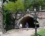 1861[103] | East Drive | Pedestrian path | 49 feet (15 m) | 14 feet 10 inches (4.52 m) | 9 feet 10 inches (3.00 m) | Willowdell Arch, a brick bridge, is faced with brick and contains a sandstone trim, like the Driprock Arch. It contains rusticated voussoirs and brick coffers in the vault.[104][105] A fountain was once located in a niche on the northern wall of the vault.[105][103][106] |