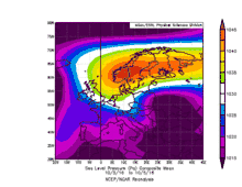 Extreme pressure values in Europe show both seasonal and geographical differentiation. The greatest pressure extremes occur in winter (January) with the deepest lows occurring to the northwest of the continent with a diminishing influence of low pressure to the southeast towards Central Europe and Southeast Europe.[1] This is related to the main cyclonic centre of the Icelandic low, and the North Atlantic extratropical storm track, close to which have been observed some of the lowest atmospheric pressures of the Northern Hemisphere outside the tropics. Extreme high values are favoured over the north east of Europe where intense cold and long winter nights lead to cooling of the air column by radiative cooling causing sinking air reinforcing the development of the highest pressures. Other influences include the semi-permanent Azores high, and Siberian highs.[2]