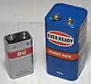 ![]() | 4.5-volt | 1289 (in the UK) Pocketable battery 4.5 V MN1203 Type 3336 (Soviet Union/Russia) | 3LR12 (alkaline) 3R12 (carbon‑zinc) | 3LR12 (alkaline) 3R12 (carbon‑zinc) | 6100 (alkaline) 1200 (carbon‑zinc) | Alkaline carbon‑zinc (3 cells): 4.5 | Two 6–7 mm wide metal strips +: shorter strip −: longer strip | H: 67 L: 62 W: 22 |