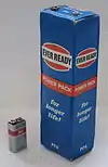 ![]() | 9-volt or E[13] | PP3 Radio battery Smoke alarm battery Square battery Transistor battery 006P MN1604 Type Krona (Soviet Union/Russia) | 6LR61 (alkaline) 6LP3146 (alkaline) [14] 6F22 (carbon‑zinc) 6KR61 (NiCd) 6HR61 (NiMH) | 1604A (alkaline) 1604D (carbon‑zinc) 1604LC (lithium) 7.2H5 (NiMH) 11604 (NiCd) 1604M (mercury, obsolete)[15] | 565 (alkaline) 400 (carbon‑zinc) 1,200 (lithium) 175–300 (NiMH) 120 (NiCd) 500 (lithium polymer rechargeable) 580 (mercury, obsolete) | Alkaline carbon‑zinc (6 cells): 9 Lithium (3 cells): 9 NiMH / NiCd (6, 7 or 8 cells): 7.2, 8.4 or 9.6[16] | Both on same end +: male clasp −: female clasp | H: 48.5 L: 26.5 W: 17.5 |