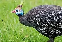 Guineafowl are a group of African, seed-eating, ground-nesting birds that resemble partridges, but with featherless heads and spangled grey plumage.