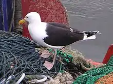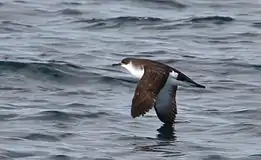 A variety of seabirds breed on the coastal cliffs such as Atlantic puffin, black guillemot, black-legged kittiwake, European shag and northern fulmar.[2] The island gives its name to the Manx shearwater which formerly nested in large numbers on the Calf of Man. The colony disappeared following the arrival of rats but the shearwaters began to return in the 1960s.[2] The Ayres in the north of the island have colonies of little tern, Arctic tern and common tern.[2]