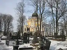 The cemetery, opened in 1863, was the third cemetery in the monastery complex, after the original Lazarevskoe Cemetery in the 1710s, and the Tikhvin Cemetery in 1823.[1] It became known as the Nikolskoe after the construction of the Church of St. Nicholas between 1868 and 1871 to the design of diocesan architect Grigory Karpov.[1][2] From its inception burial there was restricted to the elite of society, the monastery's Spiritual Council noting that "the Lavra cemetery is not open to everyone, as are the city cemeteries, but only a few persons from the government service and persons with honorary titles are buried here."[2] Part of the cemetery also served as the burial site for the Monastery's monks and the metropolitans of St. Petersburg, leading to the name Bratskoe (Russian: Братское), or "Brotherhood" section.[3] Wealthy patrons commissioned large chapels and crypts, with elaborate decorations and reliefs from prominent artists such as Nikolai Laveretsky, Ivan Podozerov, Robert Bach and Ivan Schroeder.[1]