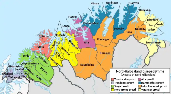 This arch-deanery (Norwegian: domprosti) is home to the Tromsø Cathedral, the seat of the Bishop of the Diocese of Nord-Hålogaland. Tromsø domprosti covers the two municipalities of Tromsø and Karlsøy. The deanery is headquartered at Tromsø Cathedral in the city of Tromsø. Administratively, the territory of Svalbard is also part of the Tromsø domprosti, although it is not part of the county. The Tromsø arch-deanery has been around since the Reformation in Norway. Before 1922, it was called the Tromsø stiftsprosti.[2]