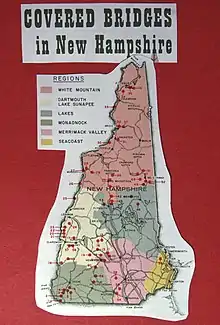 This is a list of New Hampshire covered bridges, old, new, and restored. There are 54 historic wooden covered bridges currently standing and assigned official numbers by the U.S. state of New Hampshire.[1] There are additional covered bridges extant in the state, some of which are on private property and not accessible to the public. The newest covered bridge known to have been constructed in the state is the Chester Covered Bridge, built in 2011.[2]