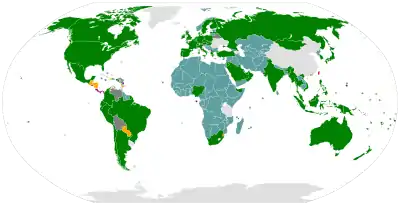 Taiwan, officially the Republic of China, has 112 diplomatic missions across the world as of December 2020.[lower-alpha 1] Due to the One-China policy, other countries are only allowed to maintain relations with either Taiwan or the mainland-based People's Republic of China.[4] As most countries have changed their recognition to the latter over time, only 17 of Taiwan's diplomatic missions have official status, consisting of fifteen embassies and two consulate-generals.[2] This makes Taiwan one of the few countries in the world that has resident embassies in all of the states with which it has formal diplomatic relations.[5]
