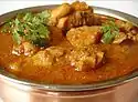 A common delicacy in South Asia, Southeast Asia, as well as in the Caribbean (where it is usually referred to as "curry chicken"). A typical South Asian curry consists of chicken stewed in an onion and tomato-based sauce, flavored with ginger, garlic, chili peppers and a variety of spices, often including turmeric, cumin, coriander, cinnamon, cardamom, and others. Pictured is Vietnamese chicken coconut curry. |