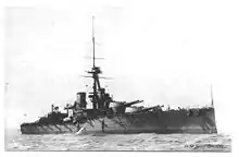 On 29 July 1914, Reşadiye was seized under the orders of First Lord of the Admiralty Winston Churchill, and on the 31st it entered the Royal Navy as HMS Erin.[147] She joined the Grand Fleet's 4th Battle Squadron on 5 September of the same year and participated in the fleet's early war sorties and drills, most importantly in response to the German attack on Scarborough, Hartlepool and Whitby.[148] At some point from September to December 1915, Erin was transferred to the 2nd Battle Squadron.[149][150] She participated in the Battle of Jutland, but was hindered by poor visibility and was the only British capital ship to not fire her main battery guns and only fired six 6-inch shells.[151] After Jutland, Erin returned to active participation in the Grand Fleet's North Sea operations, sortieing against High Seas Fleet raids on merchant convoys and at the end of war was present for the surrender of the High Seas Fleet at Rosyth, Scotland on 21 November 1918.[152][153] On 1 May 1919, Erin was assigned to the Home Fleet's 3rd Battle Squadron, but entered the reserves at Portland Harbour in October at the Nore.[85] From July to August 1920 Erin underwent a refit as a gunnery practice ship, but came to be in violation of the Washington Naval Treaty of 1922 and was sold for scrap on 19 December 1922.[154][155]