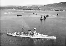 All four of the King George V-class ships were assigned to the 2nd Battle Squadron on commission, King George V becoming the Squadron's flagship by 18 February 1913, but Centurion began her career early, accidentally ramming and sinking an Italian steamer with all hands.[95] From 17 to 20 July 1914 the sister ships participated in the July Crisis test mobilisation and were shortly thereafter ordered to join the Home Fleet, soon the Grand Fleet, at Scapa Flow.[96] On 27 October 1914, Audacious struck a mine while conducting a training mission off the coast of Ireland and sank with only one death, an officer from HMS Liverpool.[97] King George V also went out of service for a brief time beginning in November 1914 because of a condenser malfunction.[98] The surviving sisters participated in a sortie that set out to engage Franz von Hipper's raiding force after its attack on three coastal British towns in December 1914, but did not see combat.[99] At the Battle of Jutland nearly two years later, the sisters did see combat but none of them fired more than 19 shells, all without effect due to poor visibility.[100] The sisters participated in the Royal Navy's subsequent war time actions and were present at the surrender of the German fleet at Rosyth on 21 November 1918. Into early 1919, the sisters remained with the 2nd Squadron, until King George V was moved to the 3rd Squadron and then became the flagship of the Reserve Fleet until 1920 when the 3rd Squadron was disbanded. She was refitted and reassigned to the 4th Squadron the same year, then in 1923 became a gunnery training vessel before finally being sold for scrap in December 1926. Ajax met the same fate, but was sold for scrap on 9 November 1926. The last of the King George V-class ships, Centurion was converted into a target ship, but was remilitarised in 1941 with light weapons and dummy main guns. On 9 June 1944, she was sunk as a block ship to defend a mulberry harbor established on Omaha Beach.[101]