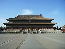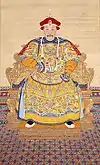 Qing succession and inheritance policies made it difficult for empresses and their relatives to build power at court, as they had in the Han dynasty for example.[13] Threats to imperial power usually came from within the imperial clan.[14] When the young Fulin was chosen to succeed his father Hong Taiji in September 1643, two "prince regents" were selected for him: Hong Taiji's half-brother Dorgon (1612–1650) and Nurhaci's nephew Jirgalang (1599–1655). Soon after the Manchus had seized Beijing under Dorgon's leadership in May 1644, Dorgon came to control all important government matters.[15] Official documents referred to him as "Imperial Uncle Prince Regent" (Huang shufu shezheng wang 皇叔父攝政王), a title that left him one step short of claiming the throne for himself.[16] A few days after his death, he received a temple name (Chengzong 成宗) and an honorific posthumous title (Yi Huangdi 義皇帝, "Righteous Emperor"), and his spirit tablet was placed in the Imperial Ancestral Temple next to those of Nurhaci and Hong Taiji.[17] In early March 1651 after Dorgon's supporters had been purged from the court, these titles were abrogated.[18]