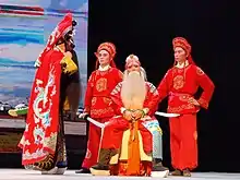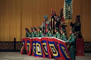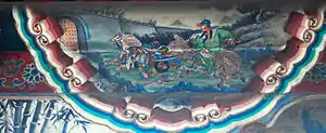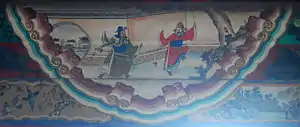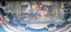 Lü Bu's biographies in the Sanguozhi and the Houhanshu mention that Lü Bu had a secret affair with one of Dong Zhuo's maids, and was afraid that Dong would find out.[16] Besides, he already bore a grudge against Dong Zhuo, who threw jis (a type of halberd) at him on some occasions to vent his frustration, but Lü Bu dodged the weapons and Dong Zhuo's anger subsided.[17] There is no historical evidence to support the maid's name being "Diaochan". That name likely referred to the sable (貂; diao) tails and jade decorations in the shape of cicadas (蟬; chan), which at the time adorned the headgear of high-ranking government officials.