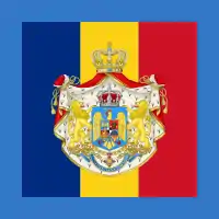![]() | 1902—1914 | Army flag of the Kingdom of Romania | Blue-yellow-red vertical tricolor with the country's coat of arms in the middle (slightly modified de facto), surrounded by a laurel wreath. In corners, the monogram of king Carol I of Romania, crowned and surrounded by a laurel wreath. |