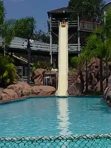 Blue Lagoon was Dreamworld's water park until it closed in April 2006. It opened in 1983 with a large pool, a children's pool and 3 water slides. The Aqualoop Flume was a body slide which featured several helices before a splashdown in the main pool.[47] Krakatoa's Revenge was the second slide to launch directly off the mountain. This tube slide was terrain based and weaved its way down the mountain before a splashdown in the main pool.[48] The third slide was the Toboggan. It was launched from a separate tower attached to the mountain. Riders would sit on a hard plastic toboggan and would plunge down a steep drop and stop in a specially designed pool.[49] Blue Lagoon's closure was just months before WhiteWater World opened as a separate ticketed complex adjacent to Dreamworld. The area has since been used for various temporary scare attractions in addition to The Dream Room function centre.